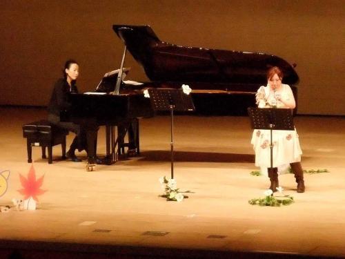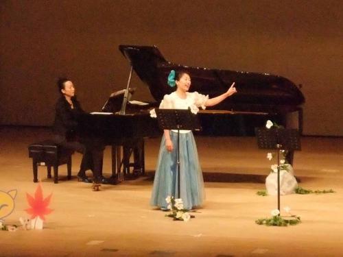 今回の構成は、歌い手がひとり。クラシックの声楽は、高い音域を歌います。座席にすわった大人のひとが、無理なく歌う音域よりは高くなります。そこで、ピアノひきが地声の音域で、ときどき一緒にうたいました。声楽と、語り&うた、というような2色で、アラフォーふたりが言葉担当です!