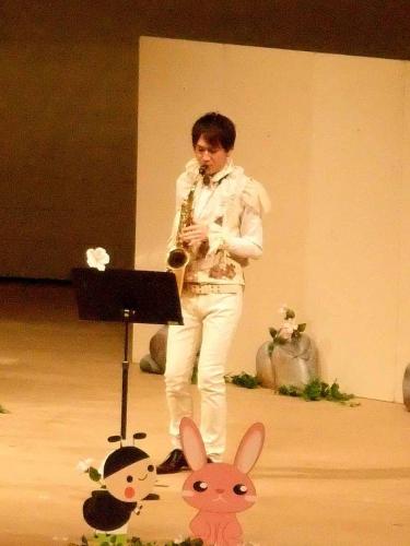 サックスは、近藤敬行。今回の衣装は、以前の作品で制作、その時に着てくれたものです。王子スタイルがぴったりのこんちゃん。この衣装を再び着るかは、こんちゃんのYES、NO次第だったのですが(笑)、YESといわせられ、他のメンバーが衣装を決定。