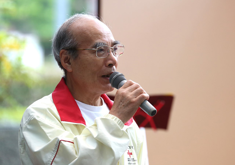 続いては、ご後援をお願いした、東久留米市赤十字奉仕団の委員長、神藤寿男さんにお願い致しました。 赤十字奉仕団は、日本赤十字社の東京都支部で、地域の皆様が、できる時にできる形で、奉仕の活動をしていらっしゃるとのことです。その活動は、日本国内に留まらず、世界の様々な地での災害や問題と繋がるものです。