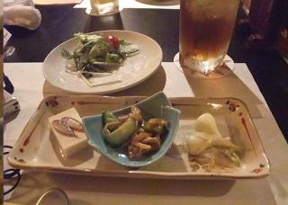 お料理のスタートはこちらから。前菜のもりあわせ。おいしそう!海ぶどうのサラダも。