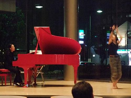 会場がオープンスペースのため、リハーサルはほとんど行えません。事前の準備と、その場の集中力。夜のこのステージは、窓が鏡のようになりますので、独特の雰囲気。びりっと熱気を感じながらの本番。